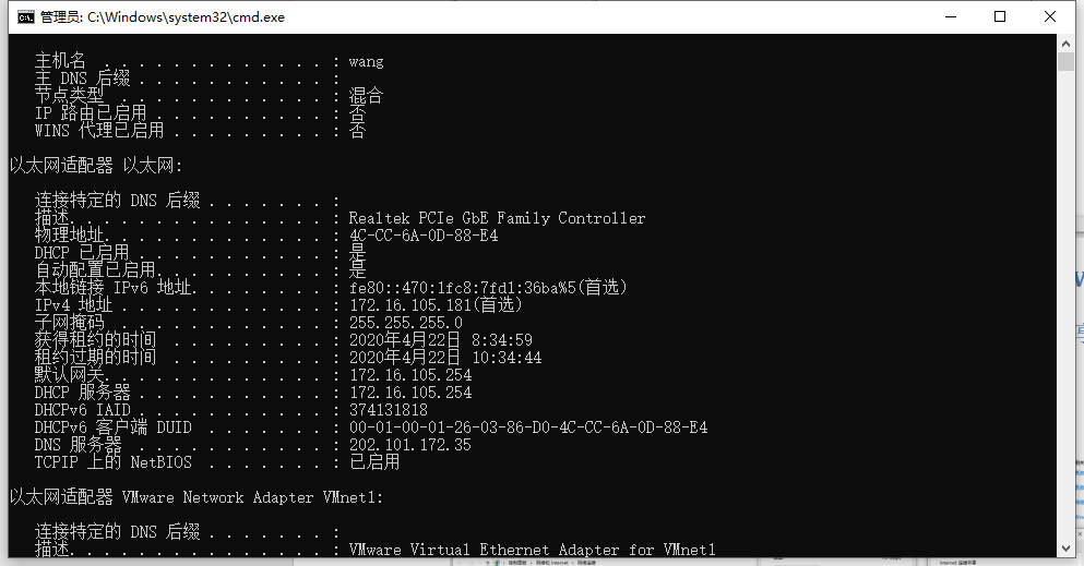 5.使用ipconfig -all命令查看DNSIPv4等信息
