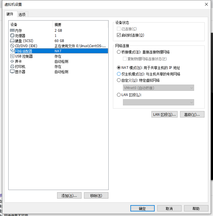 在虚拟机设置中,确认网络适配器是选择的NAT模式