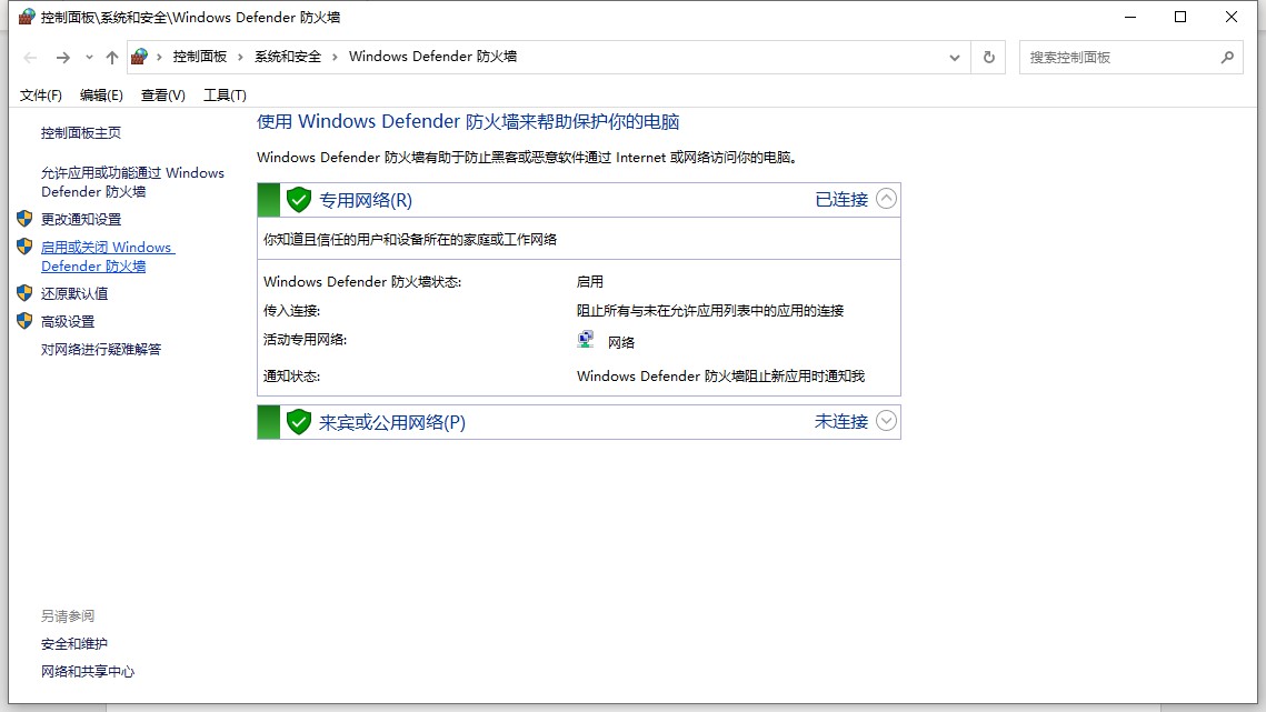 路径:控制面板\系统和安全\Windows Defender防火墙,选择启用或关闭防火墙,将防火墙关闭。