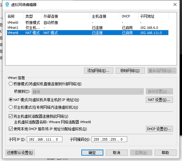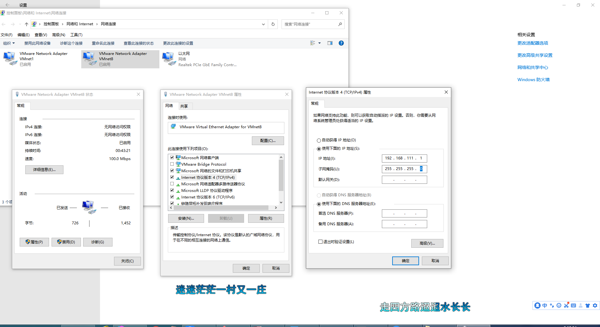路径:设置网络-更改适配器配置-选中VMnet8-属性-选中Internet协议Ipv4(TCP/Ipv4)-修改IP地址和子网掩码