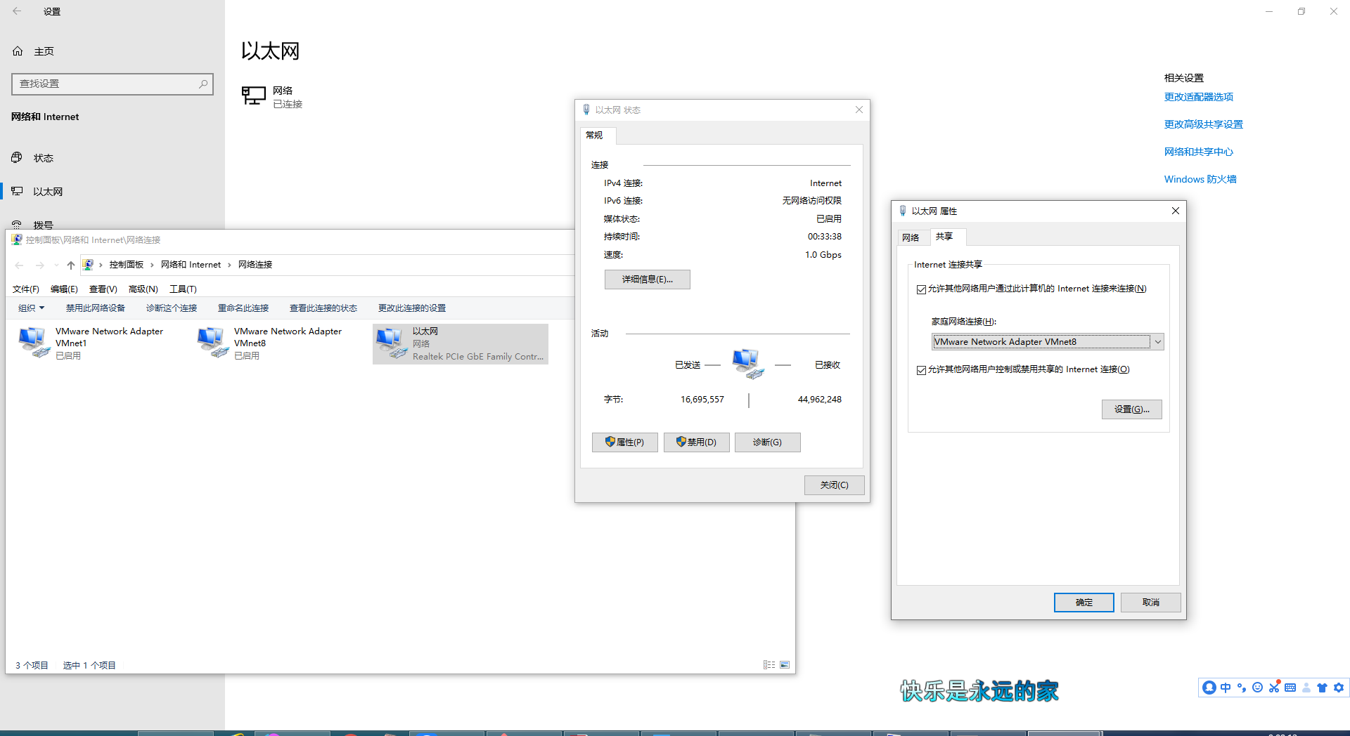 路径:设置网络-更改适配器配置-选中网络-属性-高级属性-共享-将VM8加入共享。