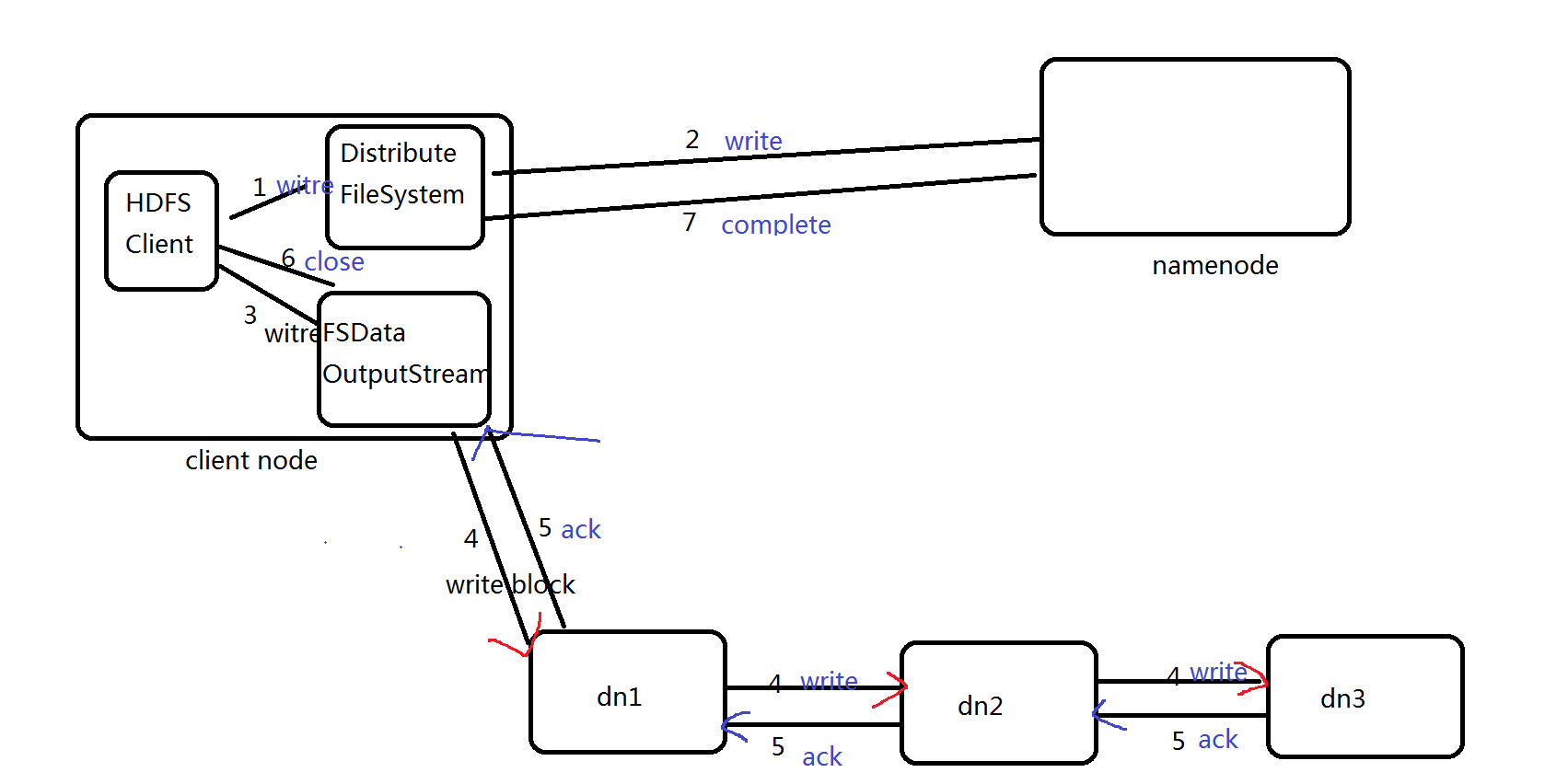 写完去第二个副本写DN2;写完去第三个副本写DN3。