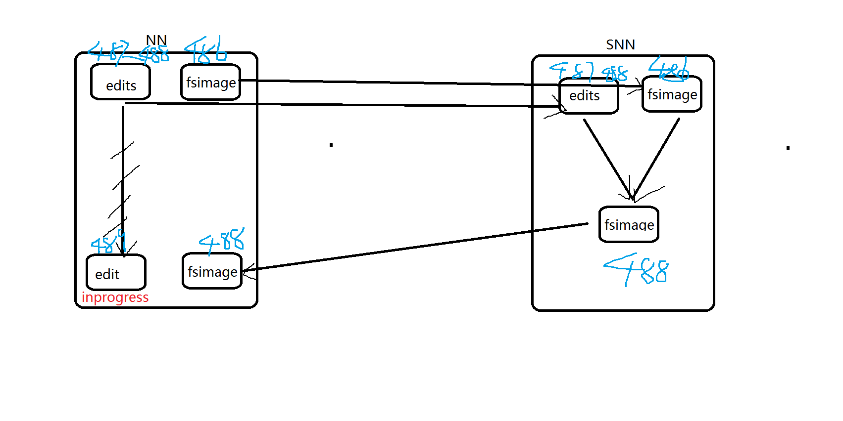 1.SNN将NN的日志文件edits475-476(图中487-488) 和镜像文件fsimage474(图中486) 接收